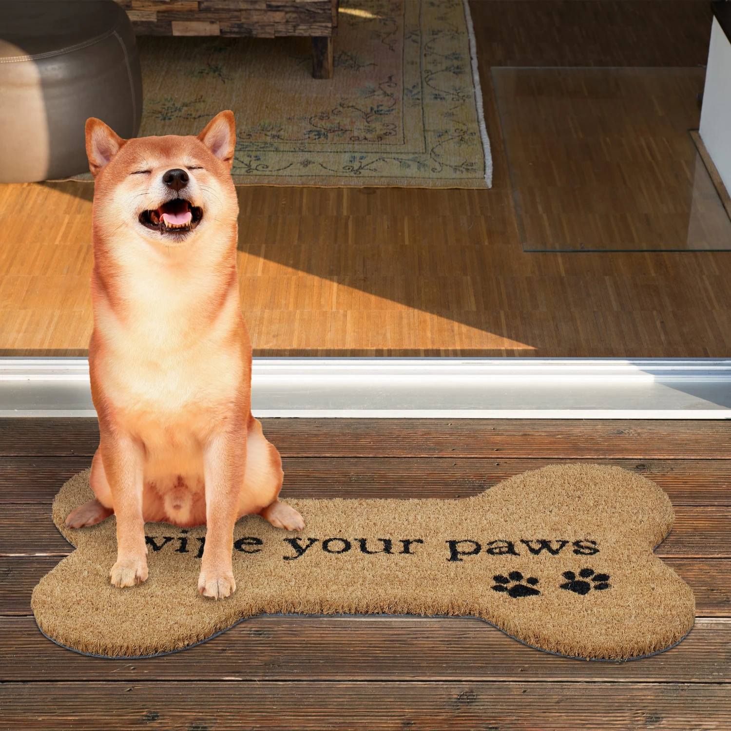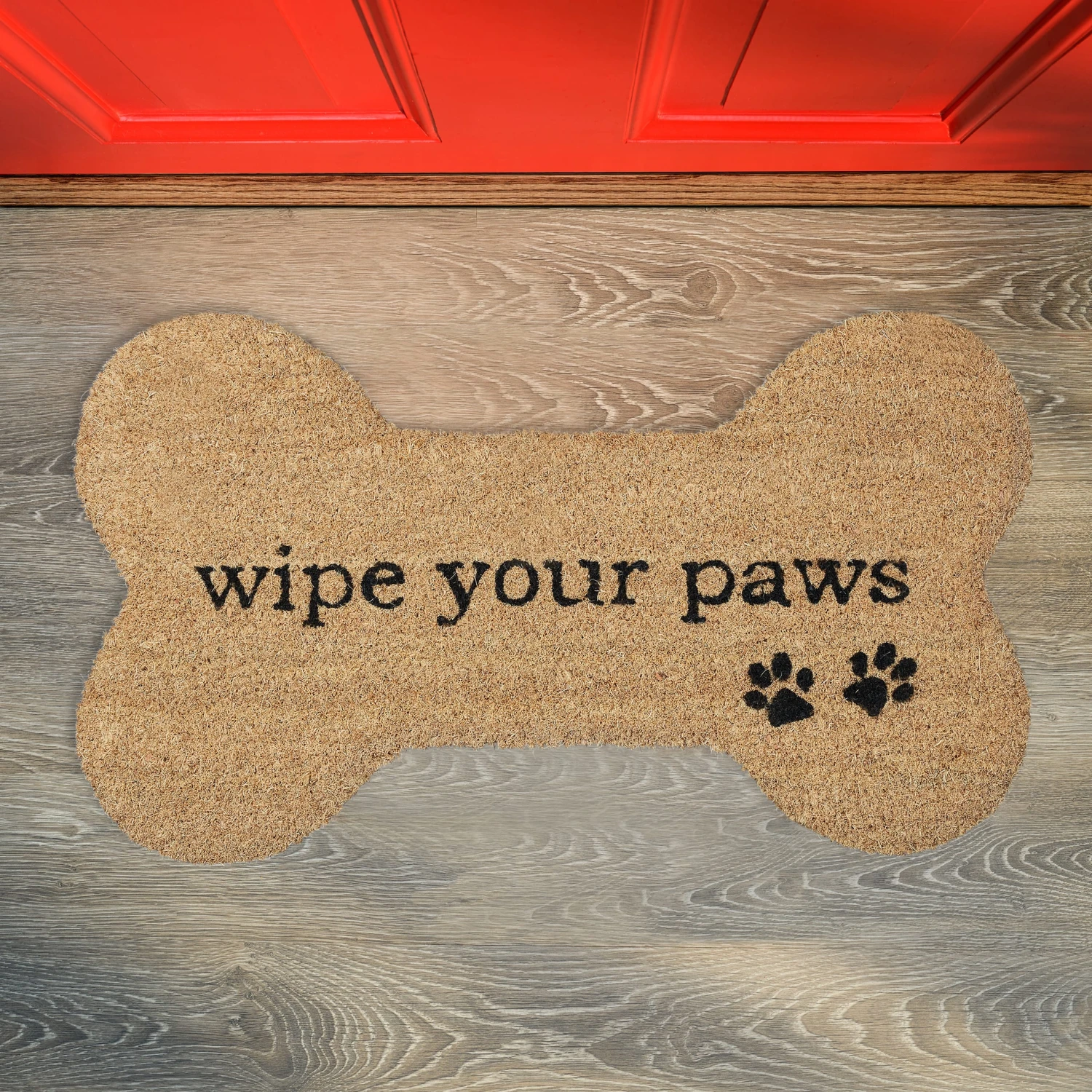 Die originelle Fußmatte mit Pfoten und Spruch zaubert Deinen Gästen noch vor dem Türöffnen ein Lächeln ins Gesicht. Doch der Schuhabstreicher in Knochenform punktet nicht nur optisch. Durch die natürlichen Kokosfasern ist die Türmatte robust und langlebig. Der umweltfreundliche Rohstoff zeichnet sich durch wetterfeste Eigenschaften aus und verleiht dem Fußabstreifer einen natürlichen Look. Die Unterseite besteht aus rutschfestem PVC, sodass der Schuhabtreter an seinem angestammten Platz bleibt.